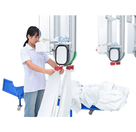 It is specially designed to achieve higher efficiency, storage quantity can be chosen from 100-800 pieces.Through linen storage mode, ensure the linens fed continuously. Alternate left and right mode, higher efficiency and stability than other hanging products, up to 8000 pieces of quilt covers in 10 hours
