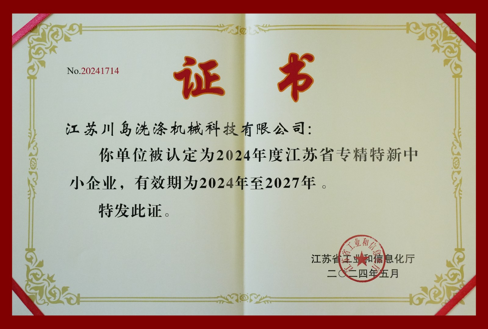 經(jīng)江蘇省工業(yè)和信息化廳的評審認(rèn)定,江蘇川島洗滌機械科技有限公司榮獲"2024年度江蘇省專精特新中小企業(yè)"榮譽稱號。這一榮譽不僅是對企業(yè)在專業(yè)化、精細(xì)化 、特色化、新穎化(簡稱“專精特新”)方面的充分肯定,更是...
